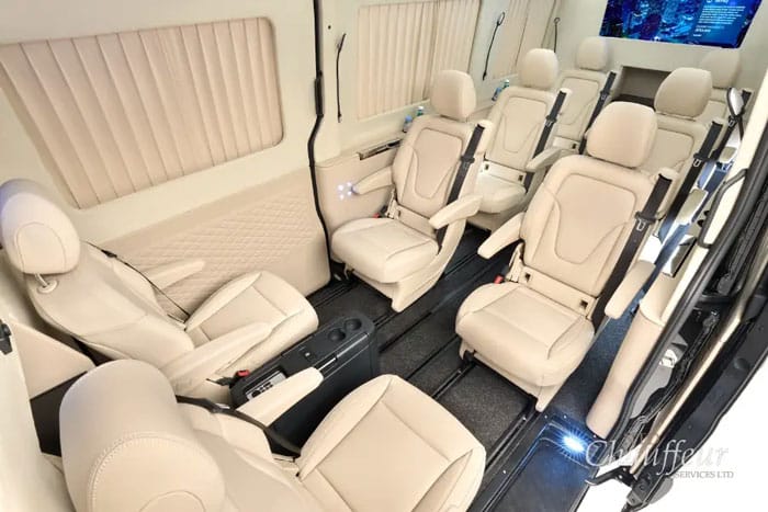 NTD Chauffeur Services is proud to present the latest addition to our fleet: the bespoke Mercedes Sprinter Senzati Jet Class — a vehicle designed to redefine luxury travel. With flexible seating configurations, you can tailor the interior to your needs, whether it’s eight manual captain’s chairs or six Maybach-style electric reclining seats featuring leg lifts, massage functions, and heating and cooling options.